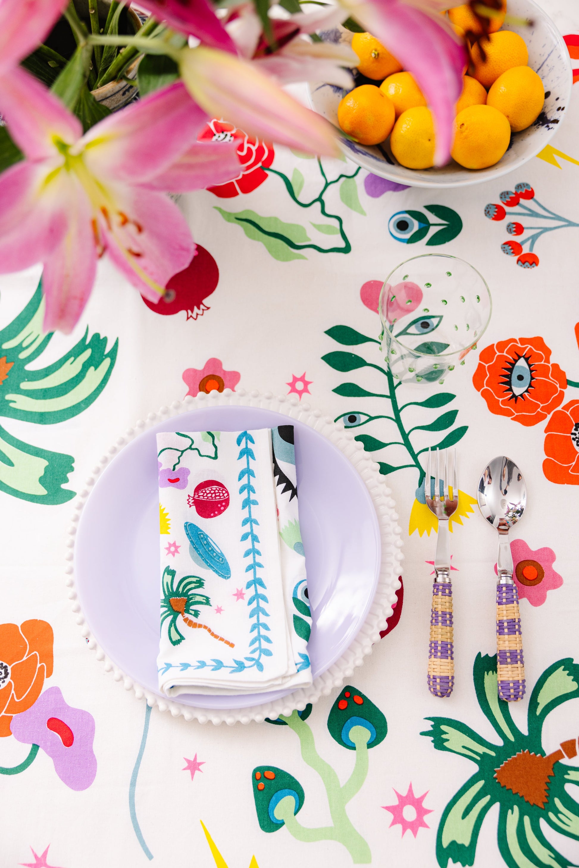 Make your meals extra festive with our exclusive screen print napkins. Handmade in India, the charming color combo and the striped trim make a bold statement. By opting for sustainable table linens over disposable, we can help cut down on waste and support an age-old craft by artisans in Jaipur.